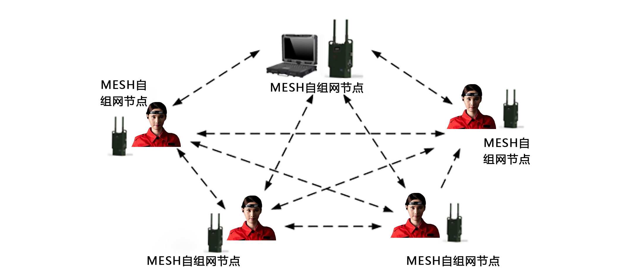 Mesh自组网通讯:每个一线人员携带Mesh自组网设备,快速搭建多点中继的分布式 通信网络。通过节点多跳续传功能,极大延展通信距离,应对复杂通信环境。具有无中心、自组织、高抗性等特点,单个节点可以随时加入和退出,都不会影响整个网络的运行和其他节点的性能。